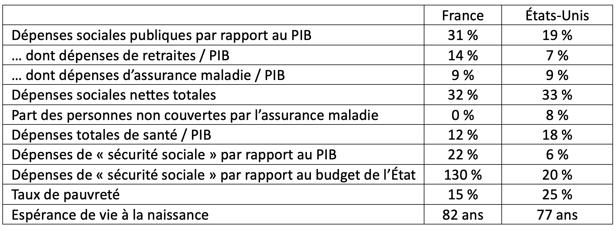 Plusieurs points méritent d’être soulignés, en se concentrant sur le niveau des dépenses sociales publiques. Avec cet agrégat, la taille des deux États-providence différencie significativement la France qui, avec 31% de dépenses sociales publiques par rapport au PIB (selon la norme OCDE), figure aux tout premiers rangs de ce groupe de pays, tandis que les États-Unis, avec 19% se trouvent sous la moyenne.