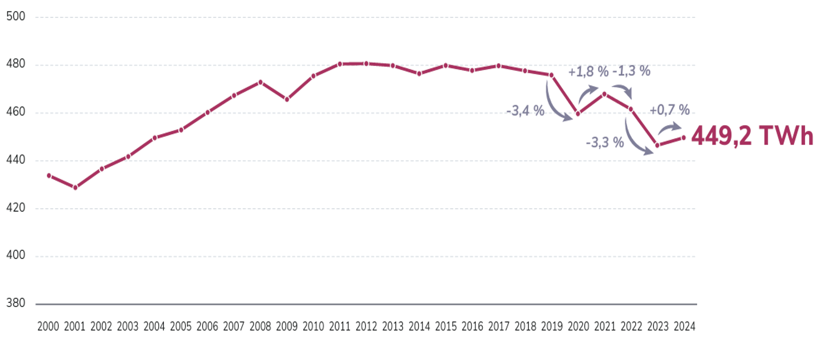 Figure. Evolution de la consommation d’électricité entre 2000 et 2024 (en TWh)