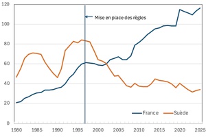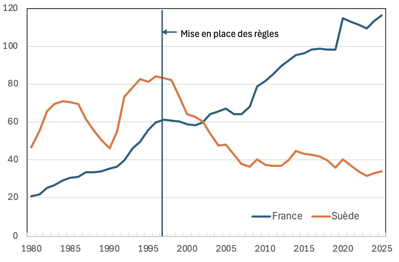 Les bonnes règles, celles qui sont efficaces, obligent les politiques à faire des choix mûrement réfléchis. Le cas d’école en la matière est la Suède. Elle n’a pas toujours été un modèle de discipline budgétaire, comme le montre la figure ci-dessous, a tel point qu’elle a connu une sérieuse crise au début des années 1990, quand plus personne ne voulait plus prêter de l’argent au gouvernement. Forcée de réagir, elle a établi un ensemble de règles, qu’elle a ensuite raffinées. Ces règles ont été appliquées en 1997. Depuis lors, la dette a été massivement réduite, puis parfaitement stabilisée sur les vingt dernières années. La comparaison avec la France a quelque chose d’humiliant, surtout que la Suède offre des services publics étendus et de grande qualité, on aimerait dire la même chose de la France.