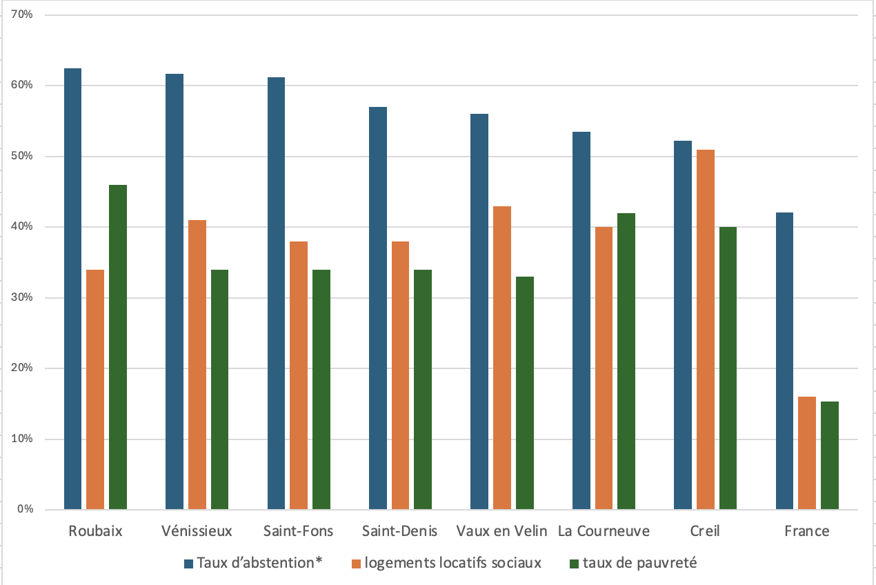 Dans toutes ces villes, l’offre électorale a rencontré une demande, mais sur un socle relativement étroit, quantitativement et sociologiquement. Rappelons quelques ordres de grandeur ici encore, pour préciser ce point. Le taux d’abstention au second tour dans ces villes oscille entre 52% (Creil) et 63% (Roubaix), contre 42% en moyenne en France. Ces taux d’abstention sont corrélés avec de forts taux de pauvreté et d’habitat social. Toutes ces communes ont un taux de logements sociaux voisin ou supérieur à 40% soit plus du double des moyennes nationales, sans compter l’habitat privé indigne, logement social de fait qui accueille les plus pauvres parmi les pauvres. Le taux de logements locatifs sociaux va de 34% (Roubaix) à 51% (Creil), contre une moyenne de 16% en France (une moyenne incluant certes les zones rurales). Les niveaux de pauvreté, de chômage et de précarité, très élevés, sont beaucoup plus forts que les moyennes régionales et nationales. Le taux de pauvreté oscille ainsi entre 33% (Vaux-en-Velin) et 46% (Roubaix), contre 15% de moyenne française.