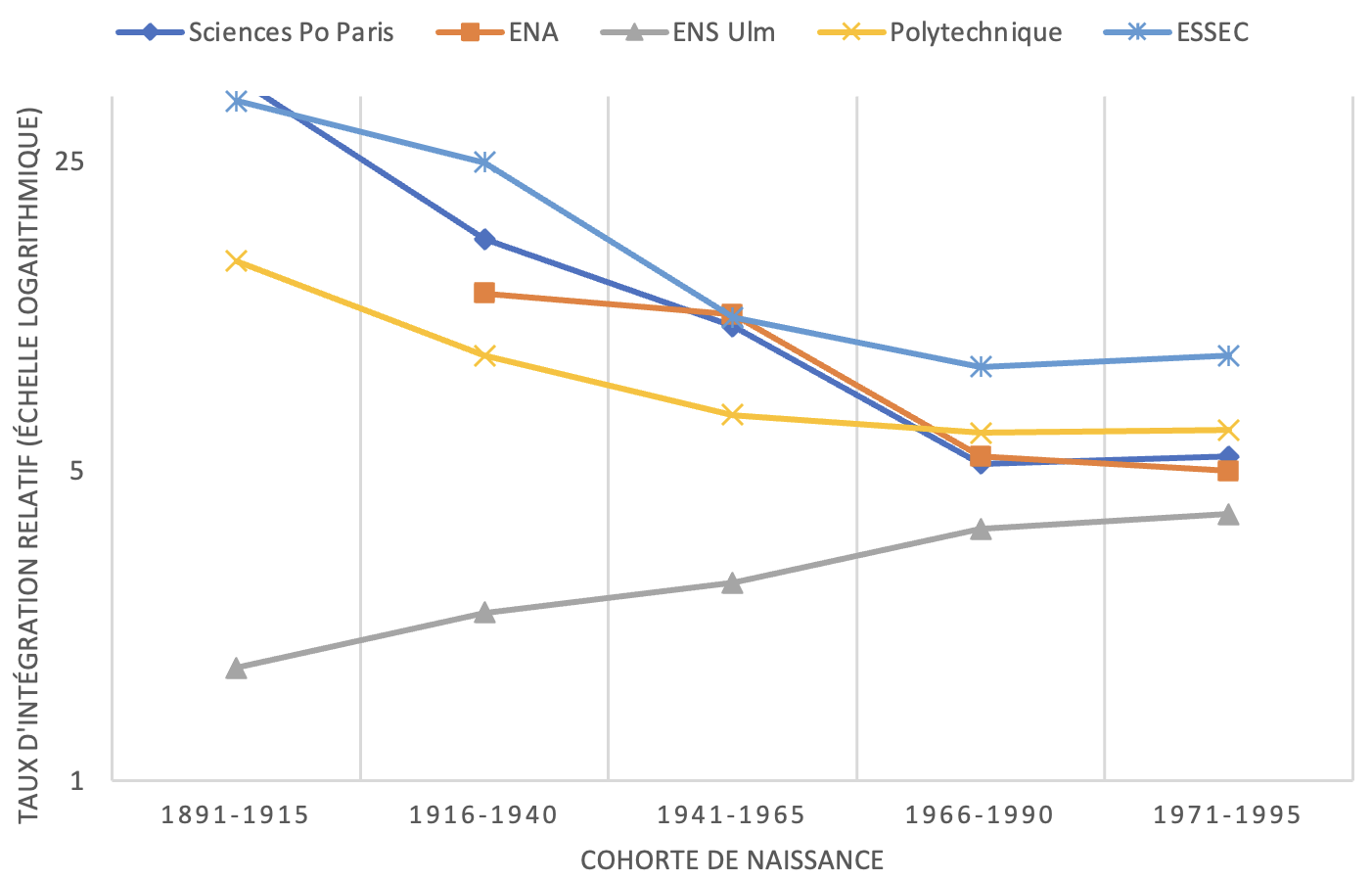 Comme le montre la figure 1 sur quelques-unes des écoles les plus prestigieuses, l’ensemble des TIR de ces écoles est nettement supérieur à 1. Dans les dernières cohortes, les individus d’origine aristocratique ont encore environ cinq fois plus de chances d’accéder à ces écoles que leurs homologues non nobles, même si sur l’ensemble de la période examinée, cette surreprésentation tend à s’affaiblir. Dans la cohorte 1891-1915, Sciences Po était l’école présentant la plus forte concentration aristocratique (TIR de 38,5). La figure 1 montre une convergence des taux reflétant, écrit Stéphane Benveniste, « un processus plus large d’alignement entre les différentes grandes écoles, sous l’effet combiné de dynamiques concurrentielles et de la standardisation internationale qui ont progressivement réduit les écarts en matière de programmes, de recrutement et de positionnement des Grandes Écoles » (p 64). On remarque néanmoins que la tendance au déclin relatif du privilège aristocratique enregistrée entre les quatre premiers groupes de générations semble s’être interrompue au dernier d’entre eux.