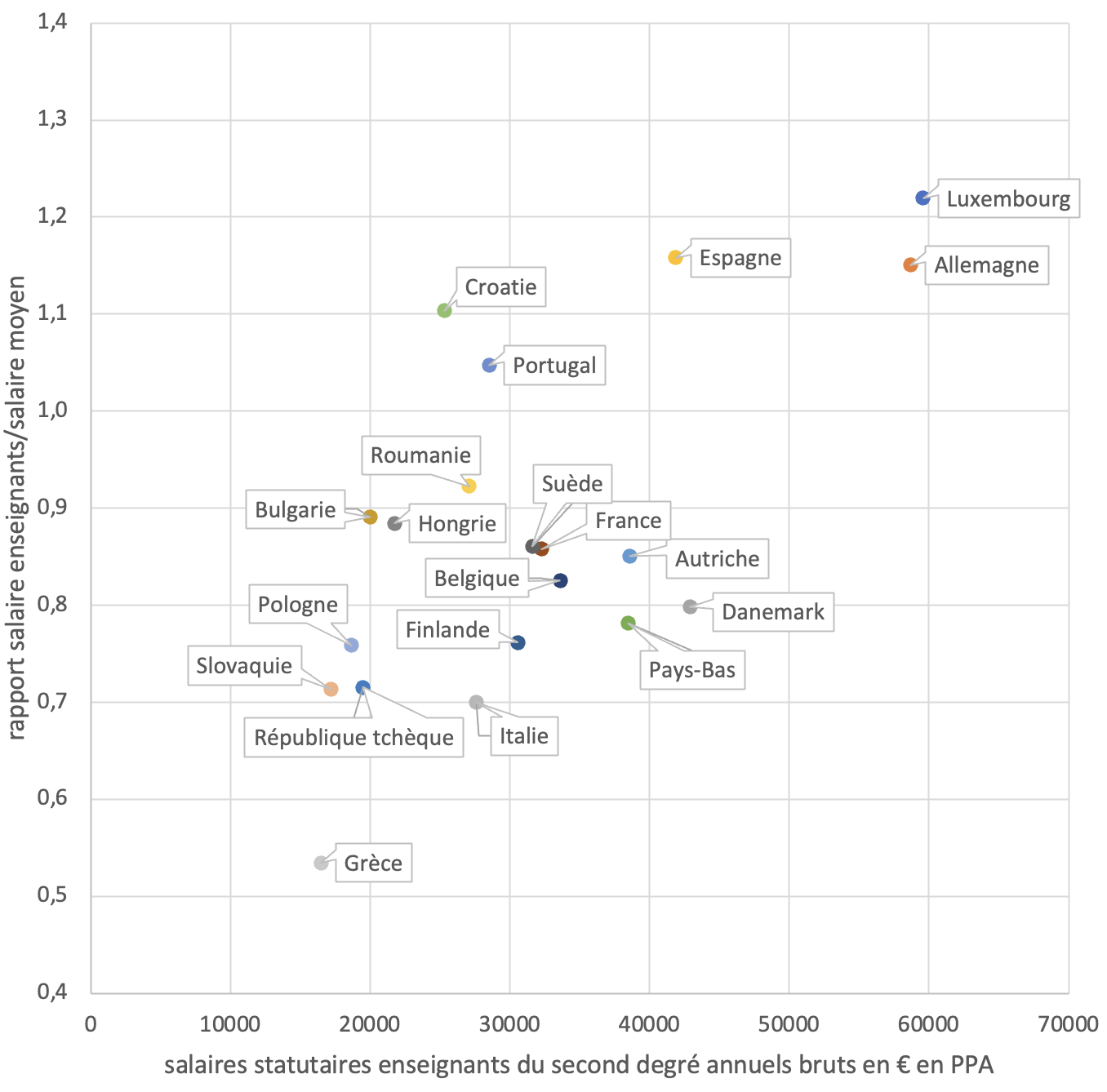 Cinq pays privilégient relativement les enseignants du secondaire : le Luxembourg, l’Allemagne, l’Espagne, le Portugal et la Croatie, même si les deux derniers se distinguent également par un salaire enseignant relativement peu élevé du fait de leur niveau de vie d’ensemble plus faible. La France se situe au centre du graphique, en position moyenne donc, sur les deux critères analysés. Mais il est frappant de voir l’écart abyssal qui la sépare de l’Allemagne, et même de l’Espagne, une économie pourtant moins puissante.